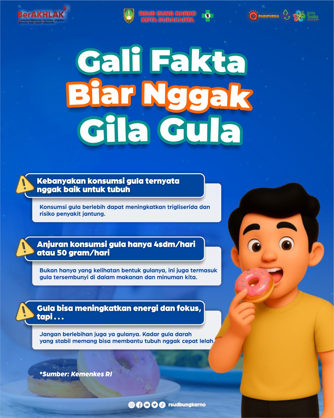 Deskripsi : Hallo #Sahabatsehat Jangan hanya tergoda sama manisnya makanan dan minuman ya Sahabat Sehat, tapi kamu juga harus tau apa saja risikonya! Yuk simak fakta ini, biar kamu nggak gila gula! Jangan lupa untuk rutin cek gula darah juga ya Sahabat Sehat!🤗 --------- ☎IGD ( 0271 ) 2936666 📞Informasi ( 0271 ) 2936300 📲Whatsapp 0811 2838 802 🔖RSUD Bung Karno "Sahabat Setia Untuk Sehat"