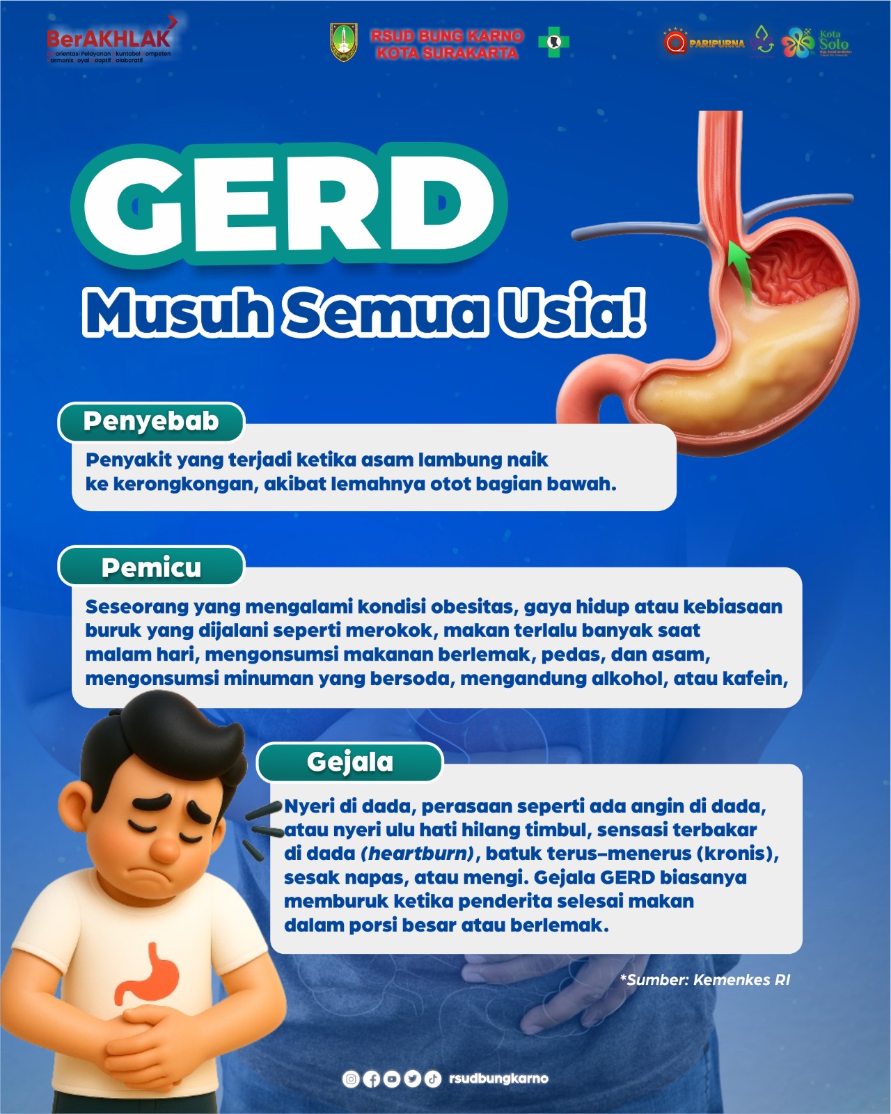 Deskripsi : Hallo #Sahabatsehat GERD dapat menyerang semua usia, mulai dari bayi hingga lansia, dan sering dianggap musuh karena dapat menyebabkan ketidaknyamanan dan komplikasi serius jika tidak ditangani dengan tepat. Waspadai penyebab dan pemicunya, seperti makan terlalu banyak saat malam hari, mengonsumsi makanan berlemak, dan lain-lain. Yuk kenali penyebab hingga gejalanya mulai sekarang, Jangan anggap sepele ya! ☺️ --------- ☎️IGD ( 0271 ) 2936666 📞Informasi ( 0271 ) 2936300 📲Whatsapp 0811 2838 802 🔖RSUD Bung Karno "Sahabat Setia Untuk Sehat"