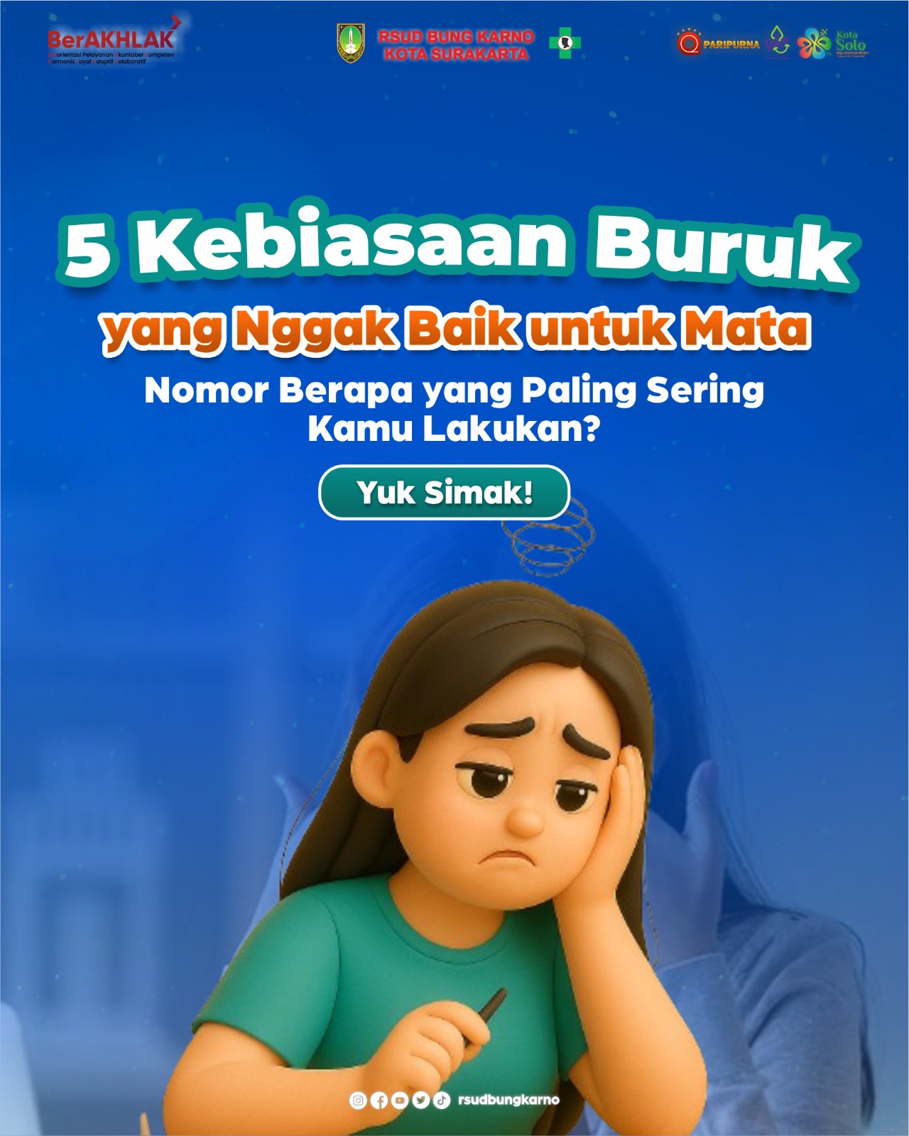 Deskripsi : Hallo #Sahabatsehat Hayoo siapa nih disini yang suka main handphone sambil rebahan ? atau membaca dengan jarak yang terlalu dekat? Hati-hati ya Sahabat Sehat, kebiasaan kecil ini bisa membuat mata kamu cepat lelah, bahkan gangguan penglihatan kalau dibiarkan secara terus-menerus loh🤔 Yuk hindari kebiasan-kebiasaan ini agar kesehatan matamu tetap terjaga ya, dan jangan lupa cek kesehatan matamu secara rutin 🥰 --------- ☎️IGD ( 0271 ) 2936666 📞Informasi ( 0271 ) 2936300 📲Whatsapp 0811 2838 802 🔖RSUD Bung Karno "Sahabat Setia Untuk Sehat"